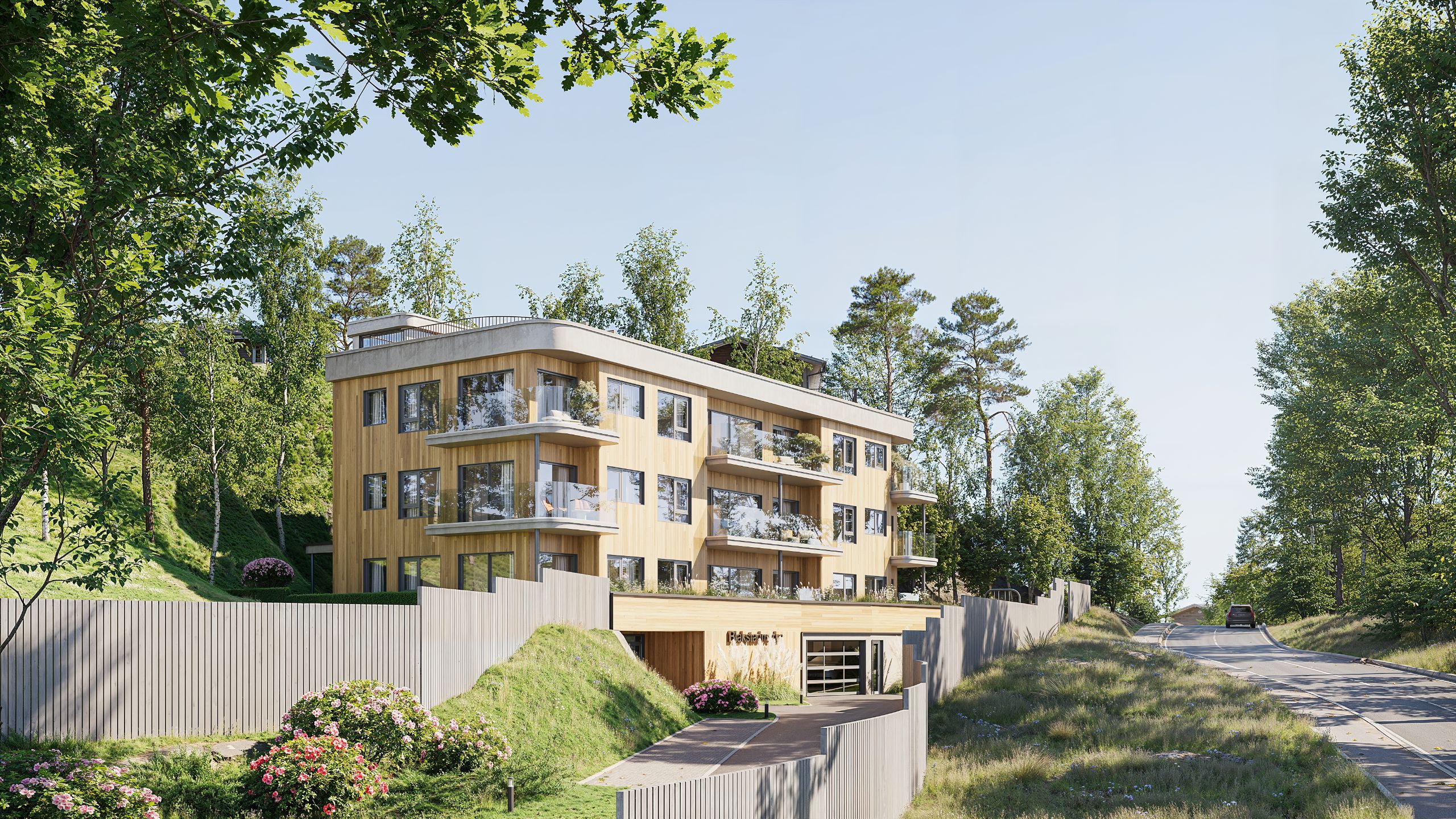 Bygget med ni leiligheter er tilpasset eiendommens topografi: svakt stigende fra øst mot en bratt fjellskrent i vest. Arkitekturen er karakteristisk, men tilbakeholden – buede balkonghjørner myker opp formene, og en markant gesims gir letthet og bevegelse uten å dominere landskapet. Fasaden i naturfarget kledning skaper varm, norsk estetikk, supplert med aluzinc-detaljer på vinduer og beslag for lang holdbarhet og lite vedlikehold.